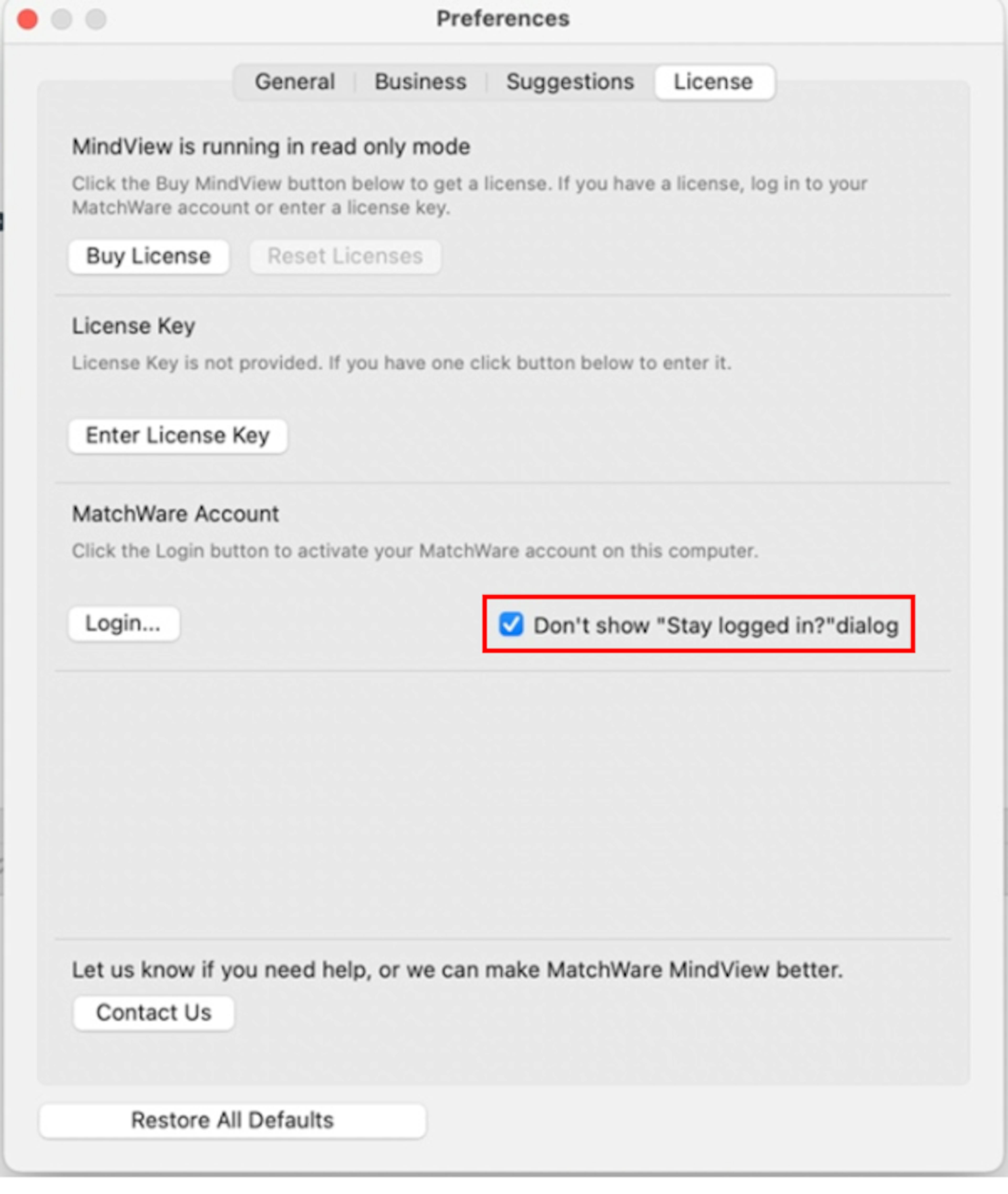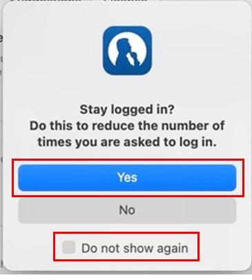 Dette sker typisk på grund af de indstillinger, der blev valgt, første gang MindView blev kørt. Hvis du ikke valgte at forblive logget ind og samtidig valgte ikke at få vist “Stay logged in”-pop-up’en igen, skal du logge ind, hver gang du åbner MindView Mac.
