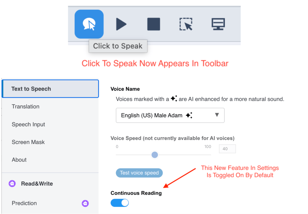 For students, the combination of Click to Speak and Continuous Reading supports: