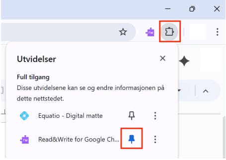 Klikk på nål-ikonet for å feste utvidelsen i verktøylinjen. Når nålen er blå vil Read&Write-ikonet være synlig hele tiden.