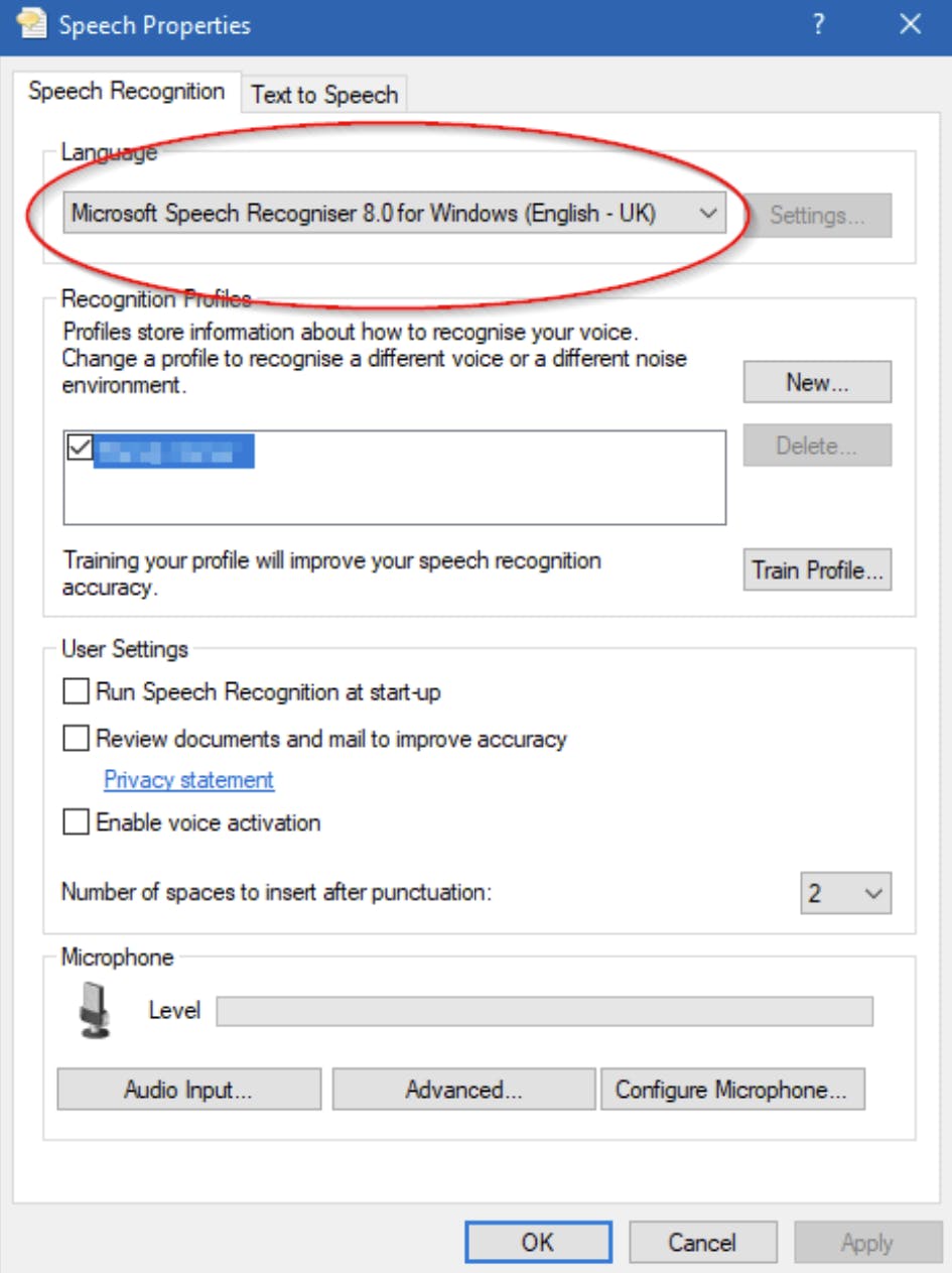 Kontrollpanel → Hjelpemiddel → Talegjenkjenning → Avanserte talealternativer