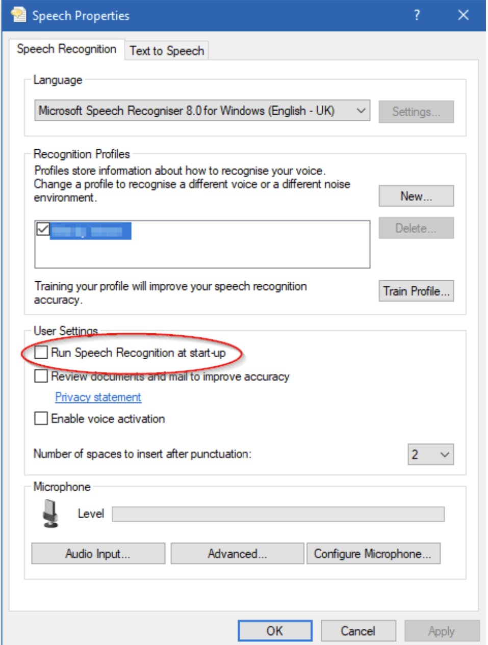 Fjern avmerkingen for Kjør talegjenkjenning ved oppstart.