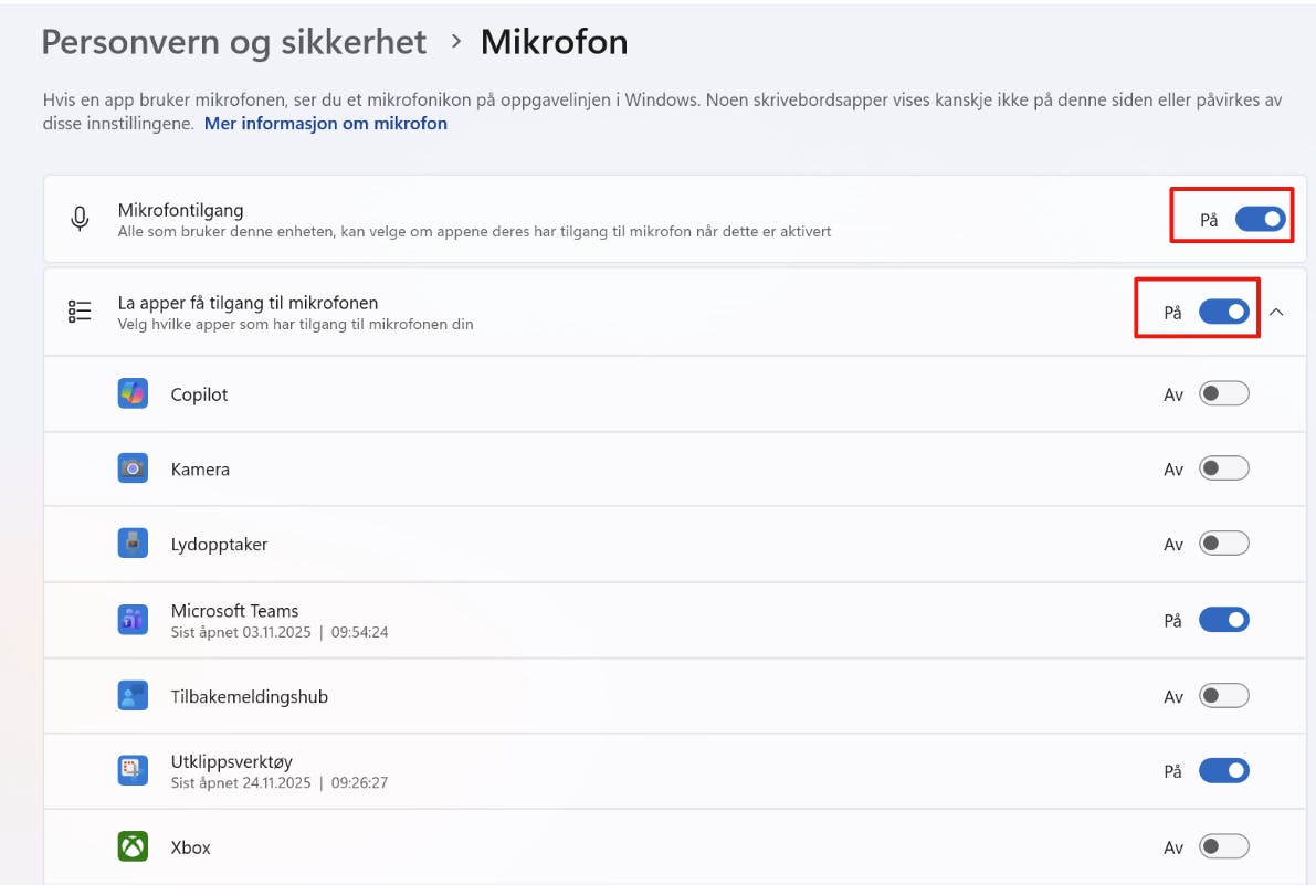 - Klikk på Mikrofon → klikk Endre og aktiver tilgang.