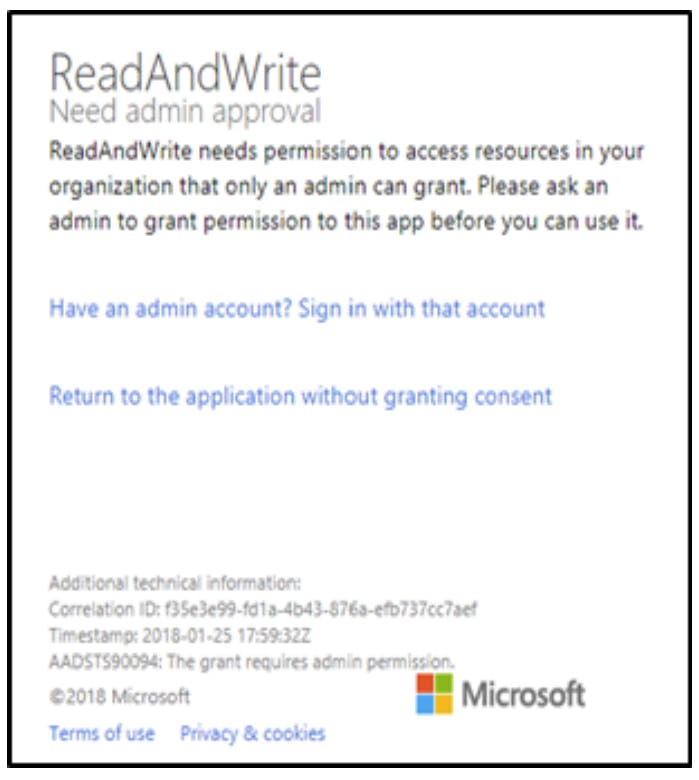 "ReadAndWrite trenger administratorgodkjenning - ReadAndWrite trenger tillatelse for å få tilgang til ressurser i organisasjonen din som bare en administrator kan gi. Be en administrator om å gi tillatelse til denne appen før du kan bruke den."