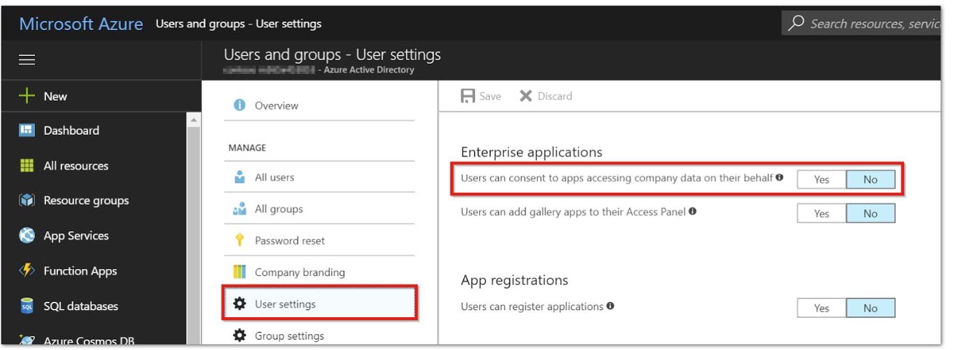 Azure AD tillater som standard brukersamtykke, men dette kan begrenses i Azure-portalen under: