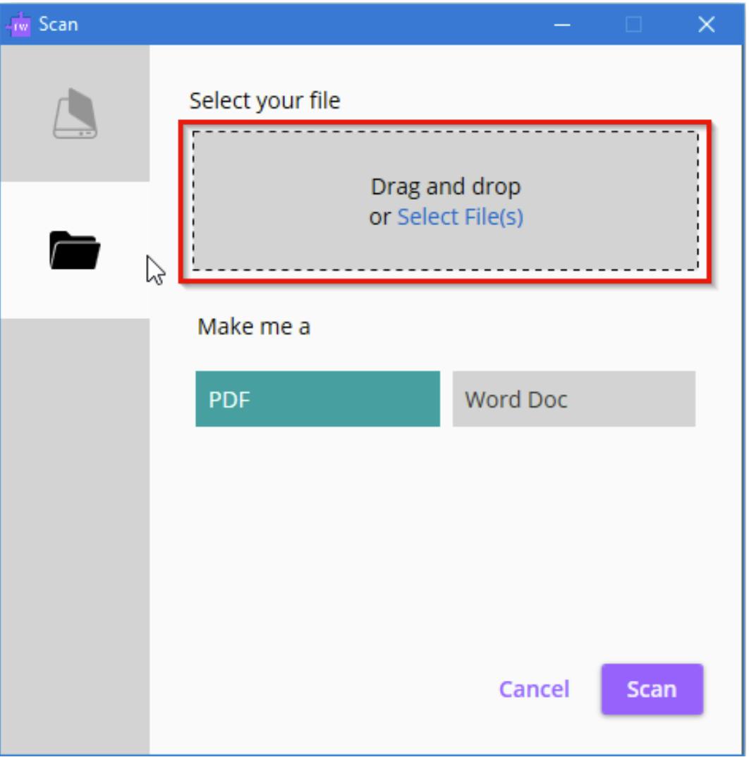 - Dra og slipp filen, eller bla for å velge filen du vil skanne, og velg hvilken filtype du vil opprette.