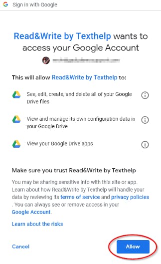 Når Read&Write for Google Chrome legges til i Chrome-profilen din, skal tillatelsessiden vises første gang du forsøker å bruke Read&Write for Google Chrome på nettet, i Google Presentasjoner eller Google Dokumenter.