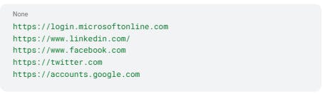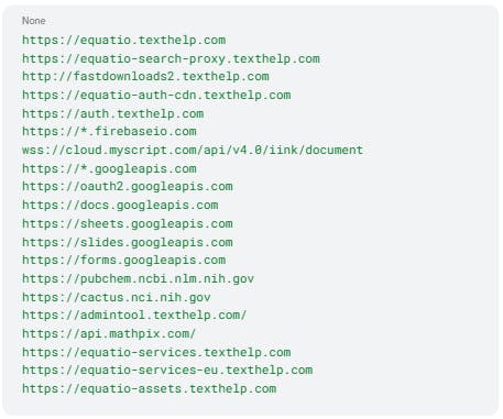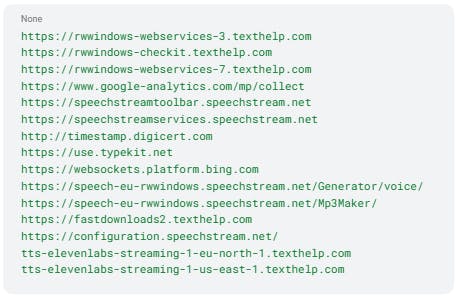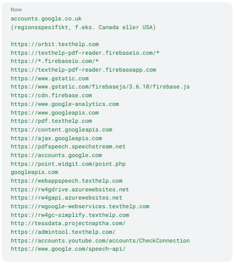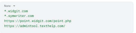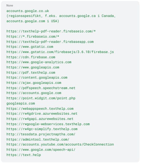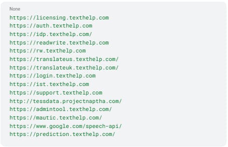 Ved å tillate toppdomenene .texthelp.com og .googleapis.com gis det automatisk tilgang til alle relevante URL-er under disse domenene som er listet i produktkategoriene nedenfor.