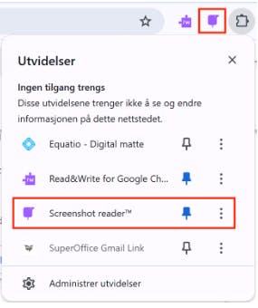 For å bruke funksjonen Screenshot Reader i Read&Write for Google Chrome må du installere Screenshot Reader-utvidelsen fra Chrome Web Store, hvis det ikke allerede er installert eller distribuert av en Google-administrator.