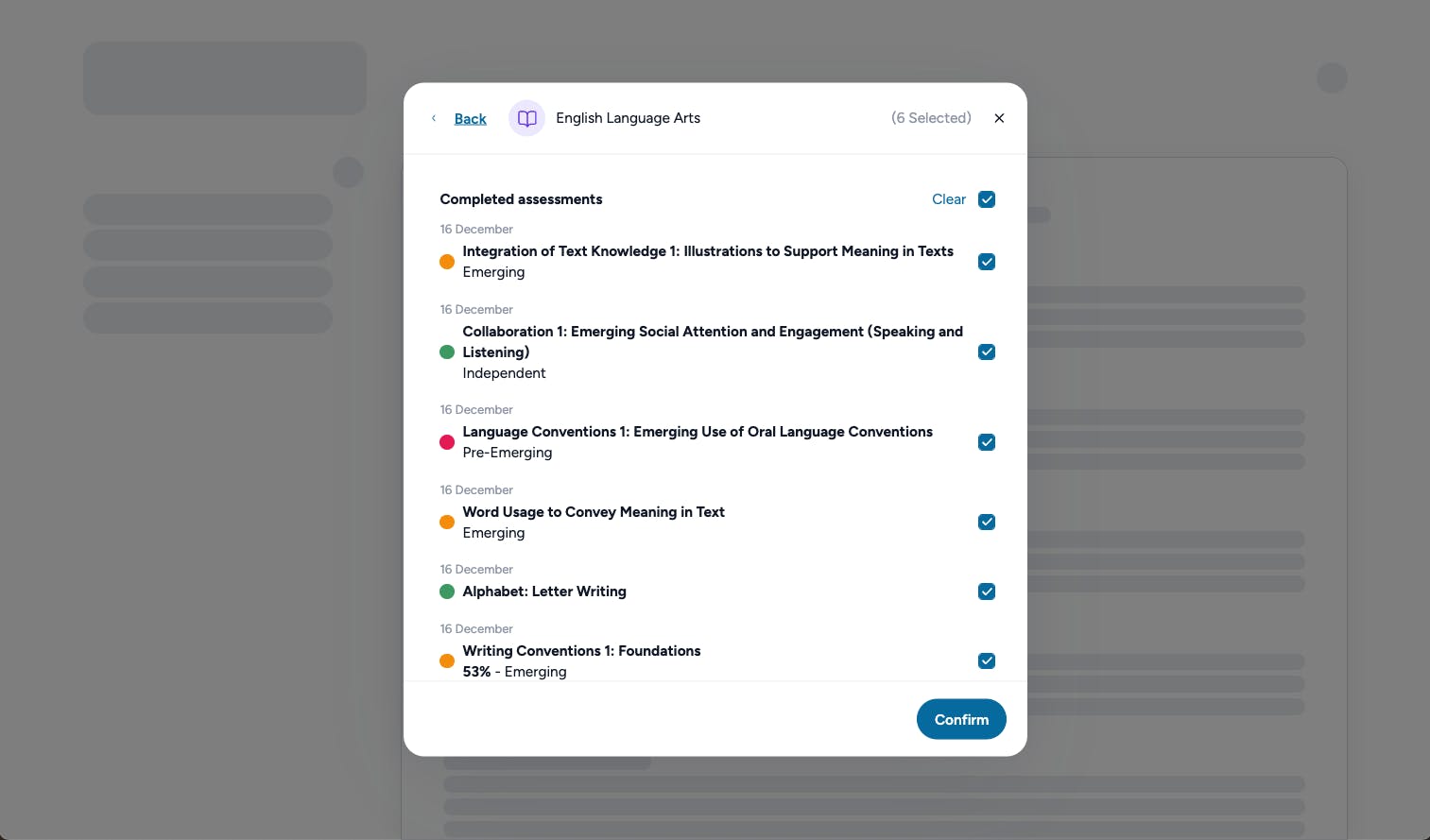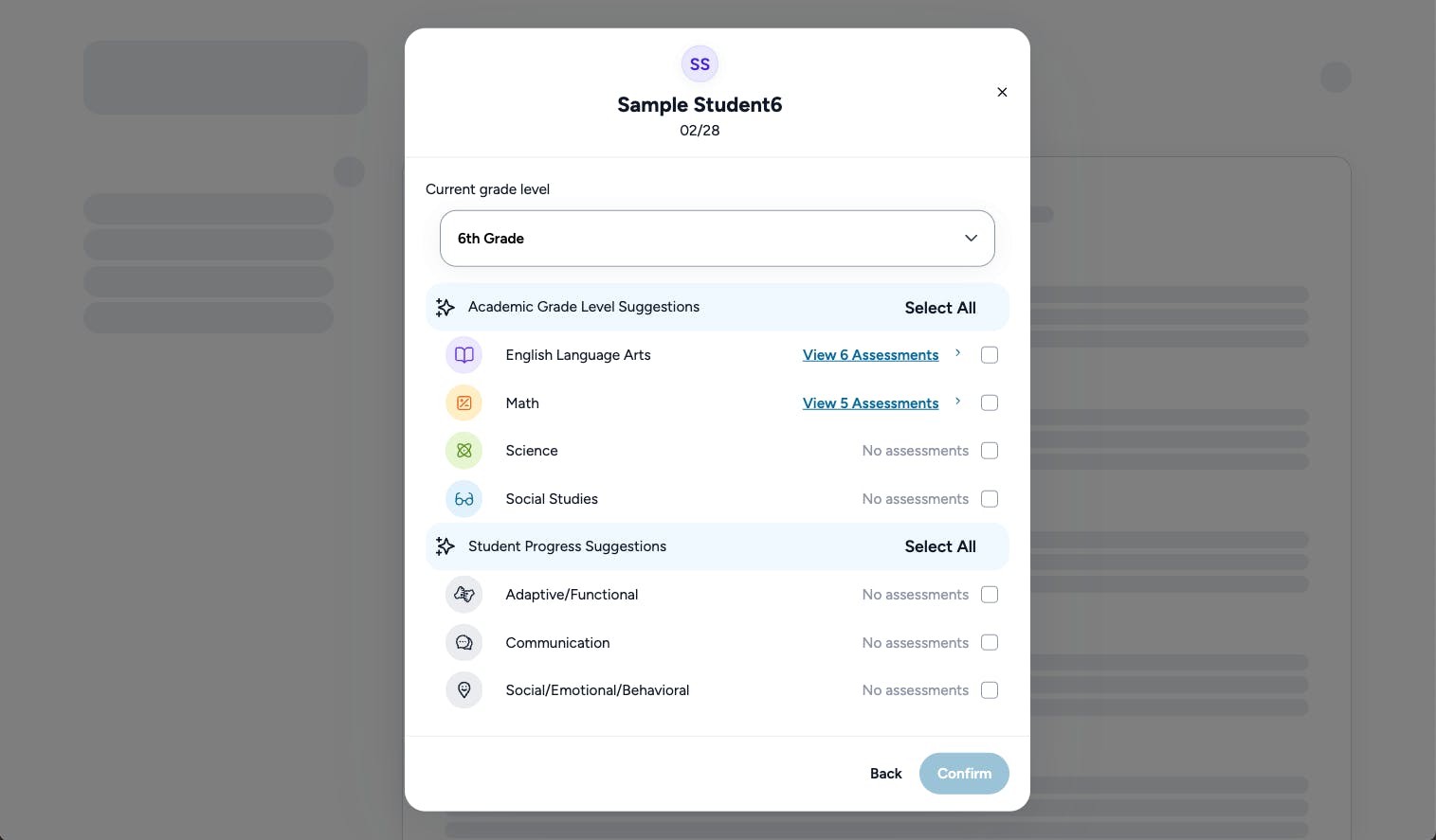 Now, in the draft IEP set up modals for the Beta experience, users can select/deselect recent assessment results to pull into the draft IEP to build recommendations.