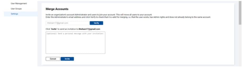 - Gå till Admin → Settings och skriv in e-postadressen under Merge Accounts.