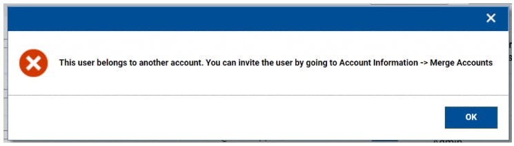 Varningsmeddelandet nedan visas när administratören försöker lägga till en användare som redan tillhör ett annat konto. Den vanligaste orsaken till detta är att användaren tidigare har skapat ett eget konto när de registrerade sig för en testversion.