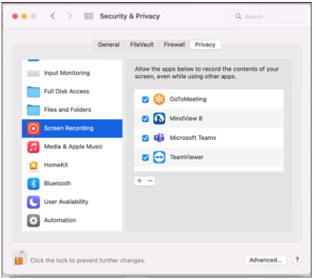 - Se till att MindView har behörighet att spela in skärmen (Screen Recording).