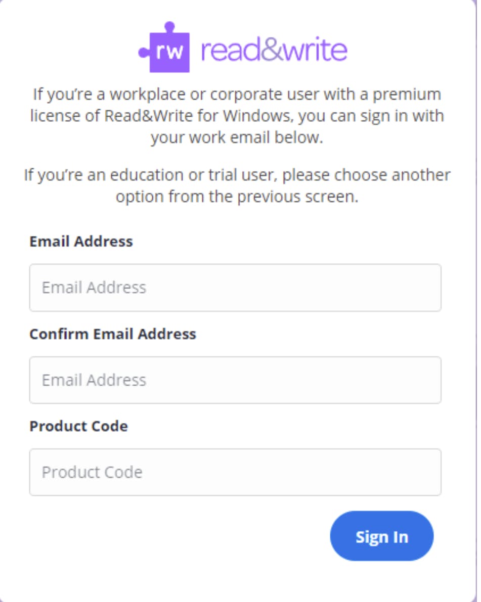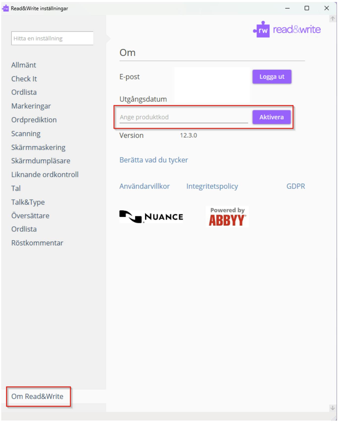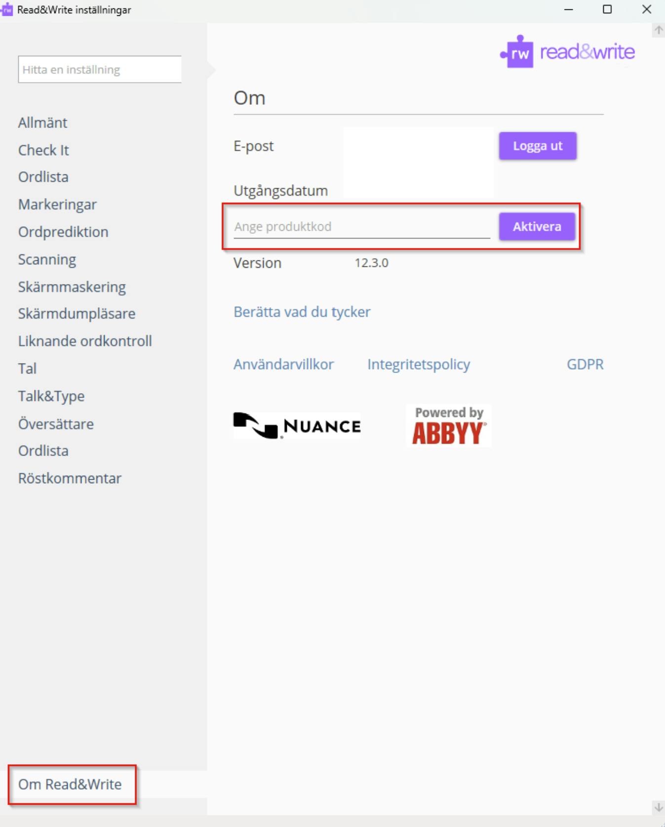- Om du tidigare loggat in med samma e-postadress minns Read&Write din produktkod och frågar inte igen.