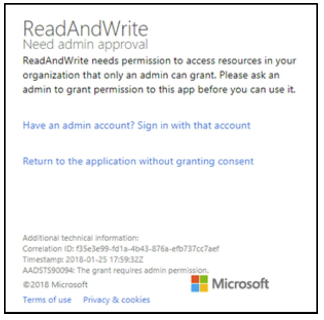 "ReadAndWrite needs admin approval — ReadAndWrite needs permission to access resources in your organization that only an admin can grant. Please ask an admin to grant permission to this app before you can use it."