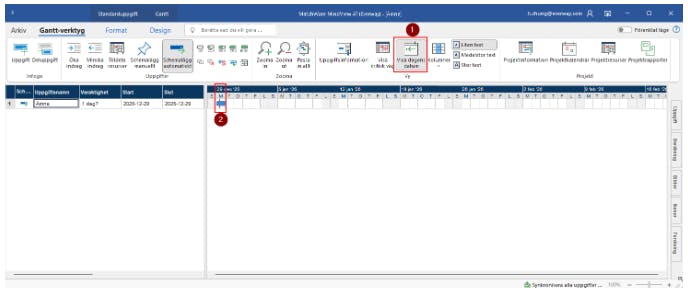 ArtikelVisa dagens datum i Gantt-diagramDatum 19:e jan. 20261 minuters läsningGå till Ribbon → Gantt Tools.Välj Show Today’s Date i View-sektionen.En röd linje visas på dagens datum.